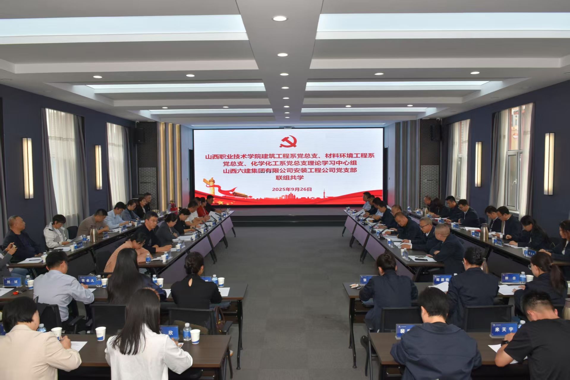 为深入学习贯彻习近平新时代中国特色社会主义思想,推动党建与业务深度融合,9月26日下午,学院建筑工程系,材料环境工程系,化学化工系党总支理论学习中心组,与山西六建集团有限公司安装工程公司党支部,在山西六建集团会议室联合开展“联组共学强思想 携手并进促发展”联组共学活动,活动以“学思想,强党性,促融合 八戒影视,谋发展”为主线,采用“沉浸式学习+政治理论研学+实践研讨交流+总结提升”全链条学习模式,学院建筑工程系党总支副书记,主任杨飞主持,双方班子成员及党员代表共40余人参加。