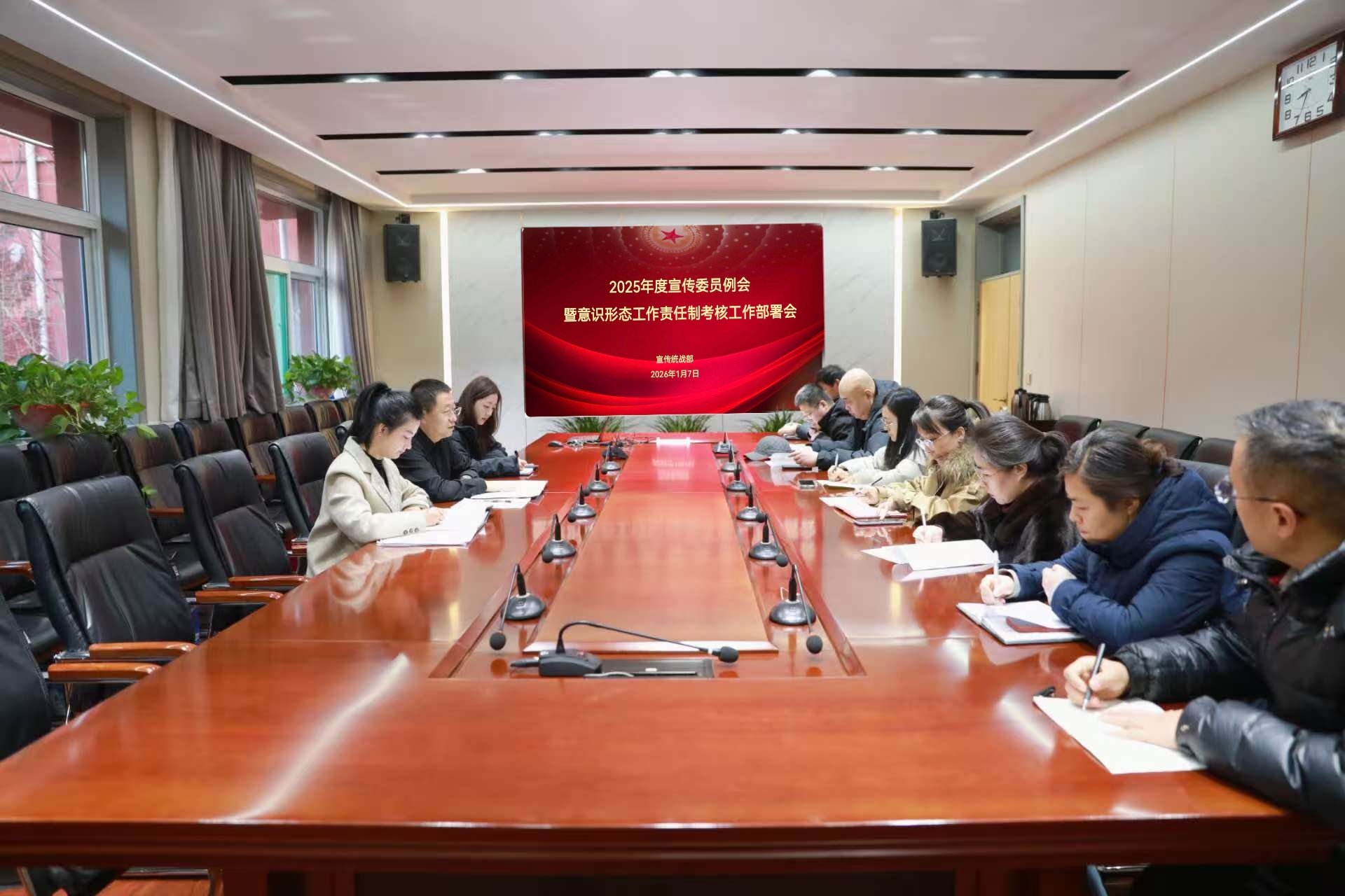 1月7日上午 八戒影视,学院2025年度宣传委员例会暨意识形态工作责任制考核部署会在坞城校区二楼会议室召开,宣传统战部常务副部长(主持工作)张蔚钦主持会议,全院宣传委员代表及意识形态工作责任制考核组成员参会,会议以“第一议题”学习开篇,同步解读考核方案,部署“十五五”思政工作与文化建设子规划征求意见等重点任务。