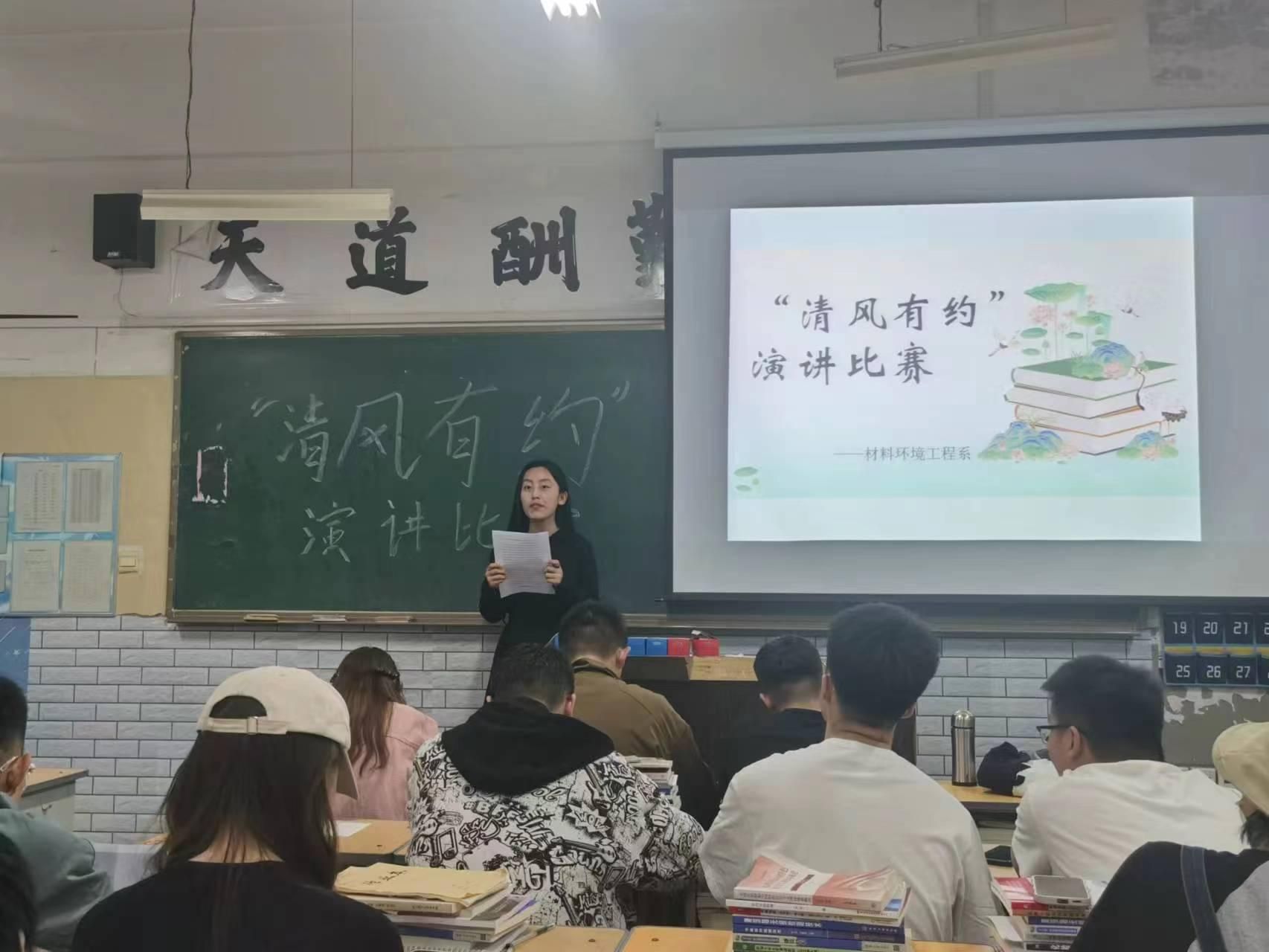 4月17日晚,材料环境工程系生活服务部在教学楼405教室举办了“清风有约”主题演讲比赛。此次演讲比赛,同学们各有精彩,充分展示了材料环境工程系学子的飒爽英姿和青春风采,激励大家以务实的态度、勤奋的精神和廉洁的作风,投入到学习工作中!让敬廉崇洁、诚信守法的清风永远飘荡在我们心中,永远飘扬在我们校园的上空!